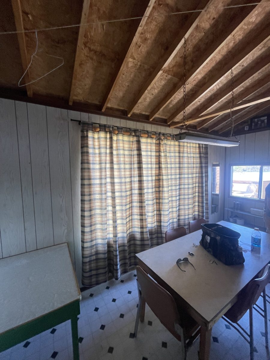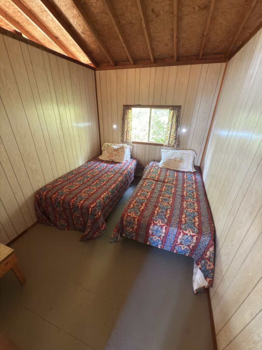checkmark Cabin equipped with propane gas stove, refrigerator, freezer, hot and cold running water, showers, solar powered electric lights, single beds (boxspring and mattress), woodstove heater, and all cooking and eating dishes and utensils.